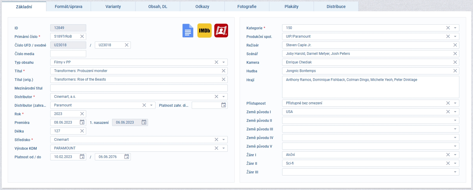 Informace filmu jsou v detailu rozděleny tematicky do několika záložek, mezi kterými je možné přepínat kliknutím na název záložky. Povinné položky jsou označeny *. Položky se šedým pozadím jsou určeny pouze pro čtení. Modul také obsahuje funkci pro zkopírování filmu