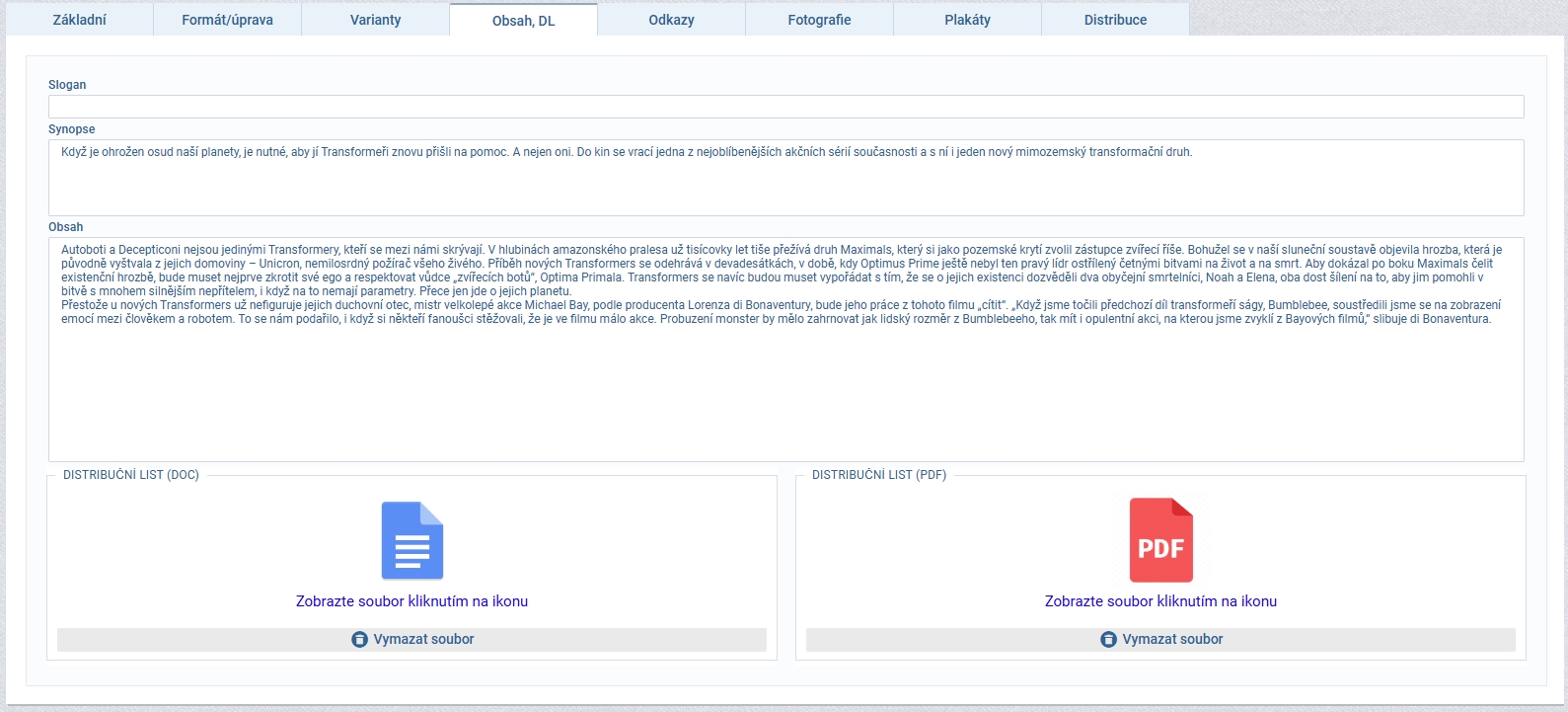 Záložka sdružující obsahové položky popisující detailněji daný film. Záložka také obsahuje pole pro nahrání distribučních listů ve formátu DOC/DOCX nebo PDF, které lze stáhnout v detailu filmu v objednávkovém systému.