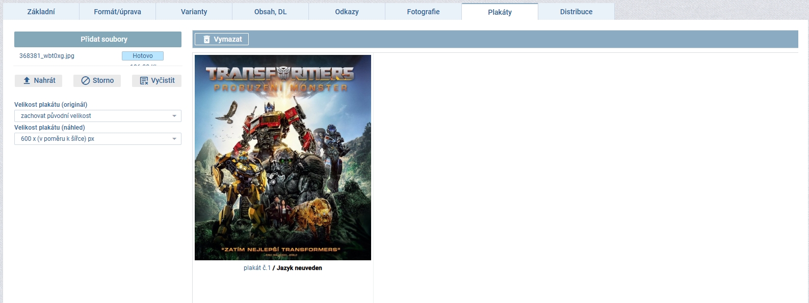 Záložka pro správu plakátů k filmu. Pro nahrání plakátů stikněte tlačítko Přidat soubory a vyberte z disku požadované plakáty. Nahrávání souborů zahájíte tlačítkem