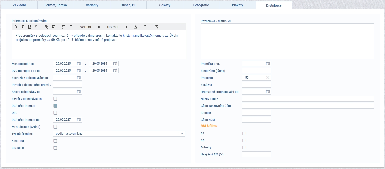 | Informace k objednávkám | Doplňující text, který je zobrazen u filmu v objednávkovém systému (s možností formátování textu). |
