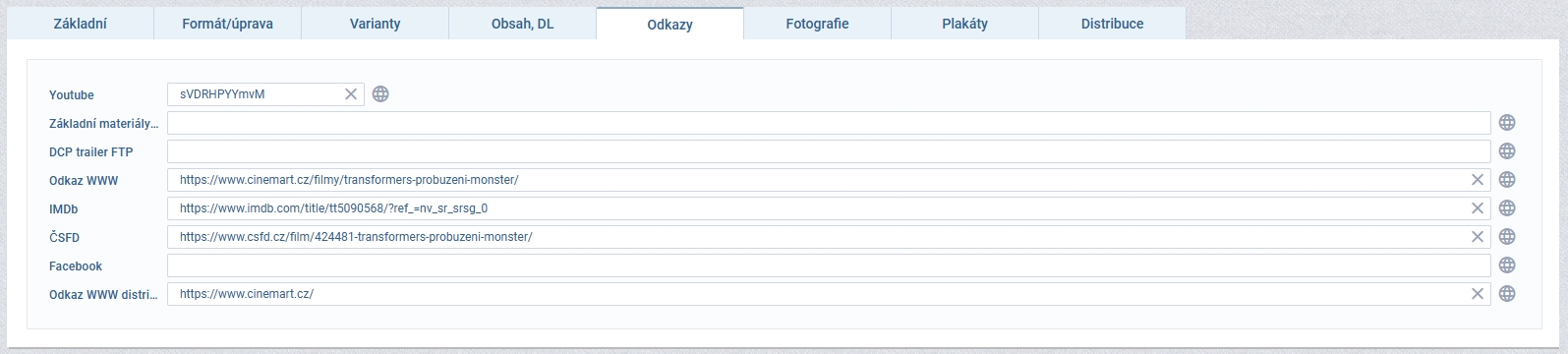 | Odkaz WWW distributora | Odkaz na stránku filmu na webu distributora / případně web distributora (zadává se celá URL) |