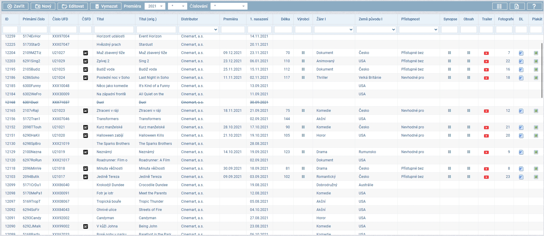 | Číslo UFD / svodné číslo | Číslo UFD, které je přidělováno Unií filmových distributorů. Číslo obsahuje prefix distributora a pořadové číslo filmu v daném roce premiéry. Při založení nového záznamu je vloženo dočasné číslo ve formátu $$$XXXXXXX. Svodné číslo slouží pro sjednocení více záznamů stejného filmu ve statistických sestavách (například při změně distributora). |
