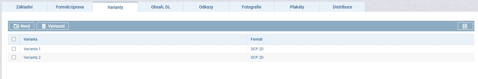 Seznam variant filmu. Varianty filmu slouží jako doplňkový parametr pro objednávkový systém. Variantu lze definovat jako volný text dle vlastní potřeby. Varianty lze definovat pro konkrétní obrazové formáty nebo v případě nenastavení formátu při vkládání nové varianty bude varianta dostupná pro všechny formáty. V případě, že jsou varianty definovány, musí kino v objednávkovém systému variantu vyplnit.