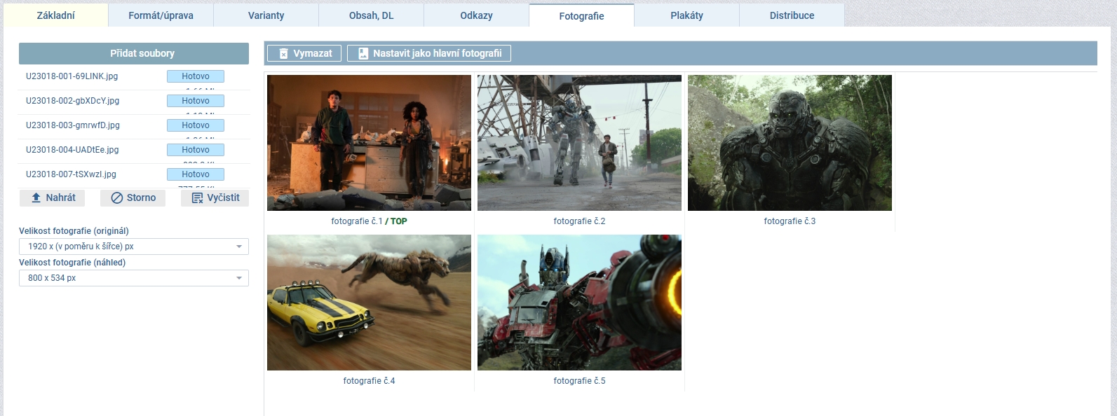 Záložka pro správu fotografií k filmu. Pro nahrání fotografií stikněte tlačítko Přidat soubory a vyberte z disku požadované fotografie. Nahrávání souborů zahájíte tlačítkem