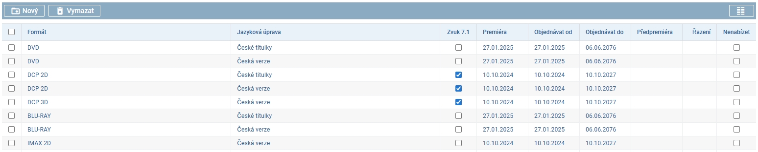 | Objednávat od | Tímto polem lze omezit minimální datum objednání nasazení filmu kinem v daném formátu/úpravě (pokud je nastaveno, má vyšší prioritu než datum premiéry formátu, hlavní datum premiéry i monopol od) |