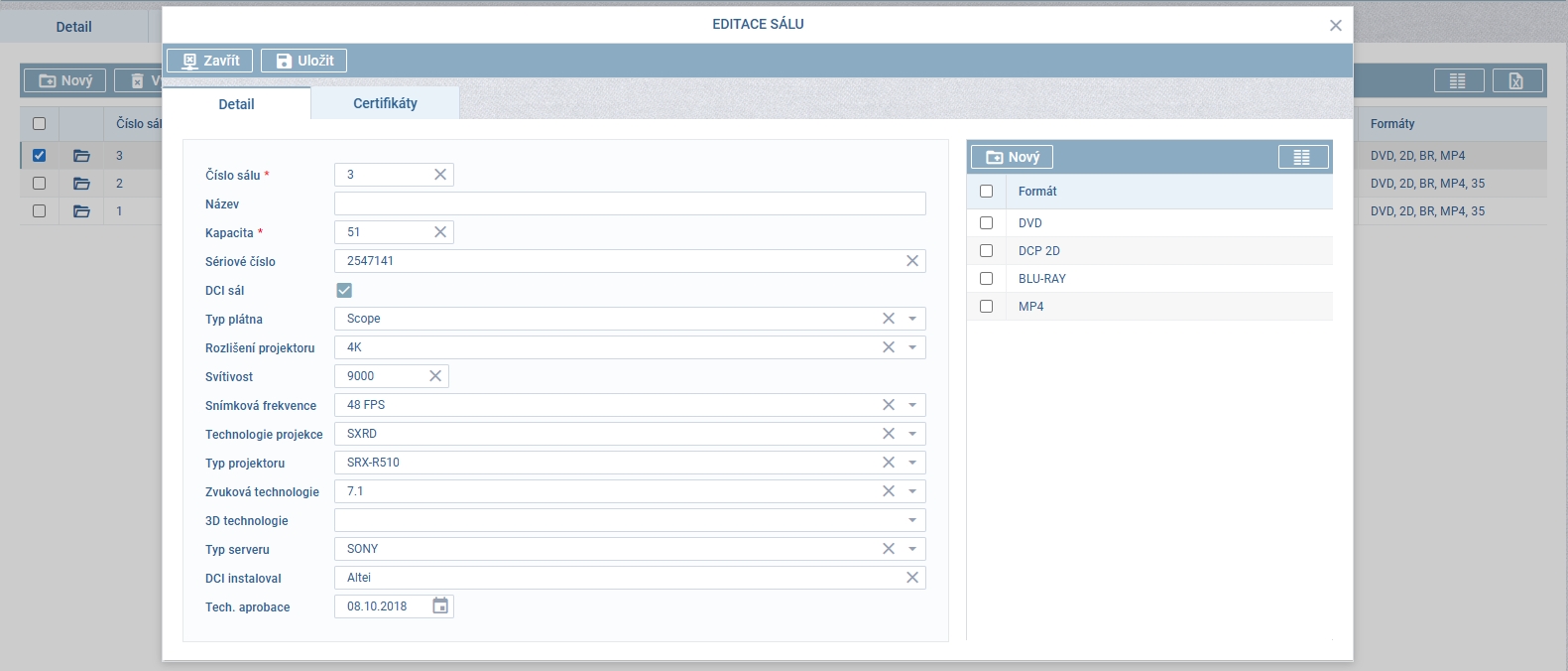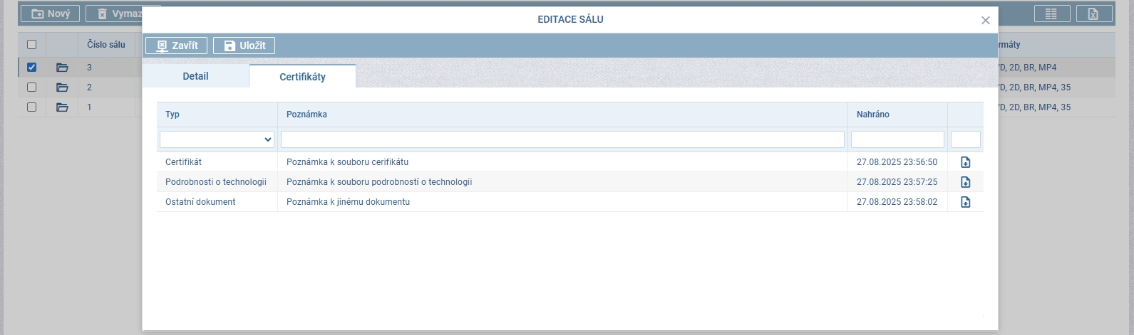 příslušného řádku sálu. Detail sálu je rozdělen na dvě záložky: Detail a Certifikáty. Záložka Detail obsahuje detailní informace o sálu. Záložka Certifikáty obsahuje seznam nahraných certifikátů k danému sálu kina.