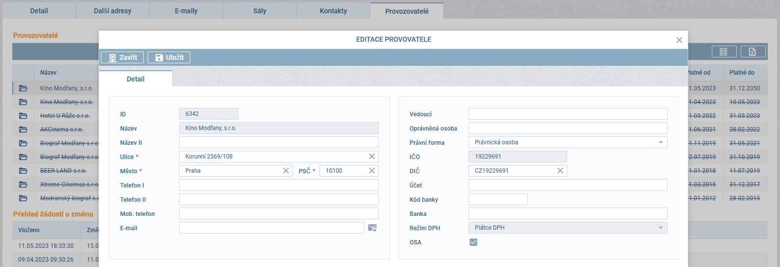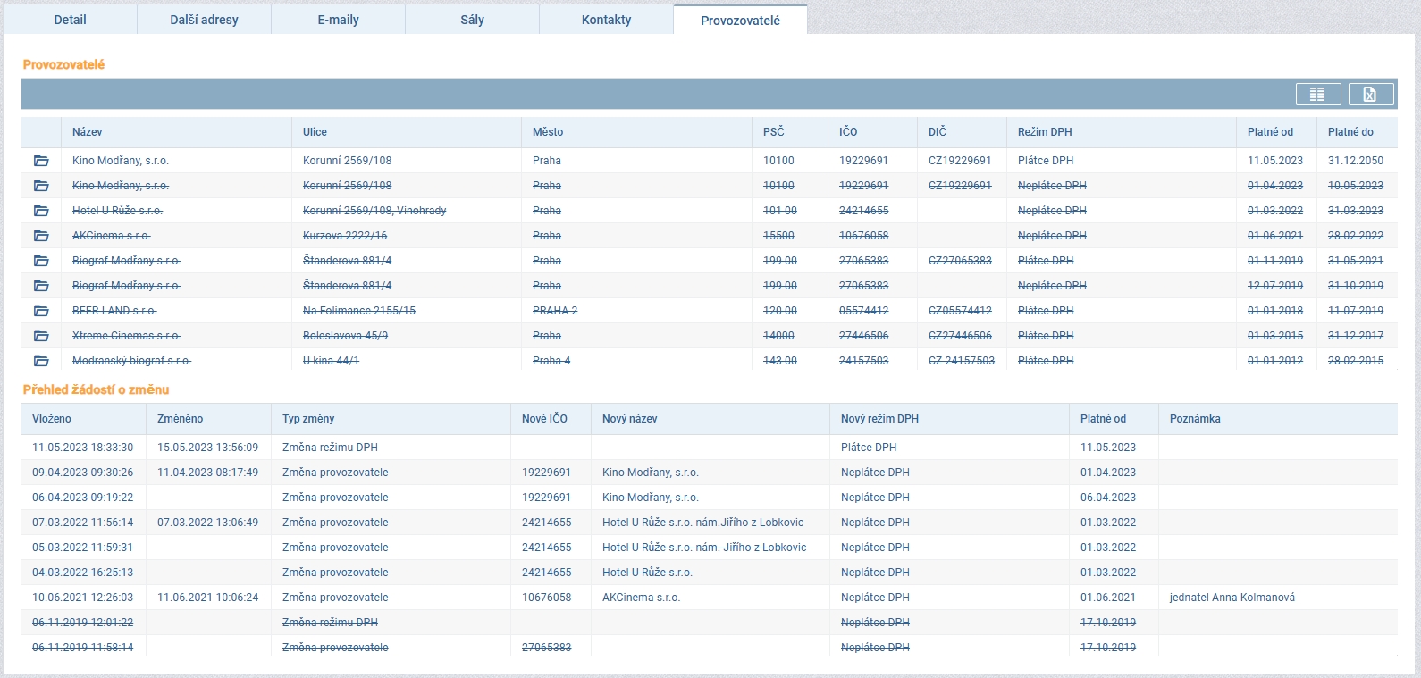 Záložka zobrazující aktuálního provozovatele, historii provozovatelů kina a také historii změn provozovatelů v systému.