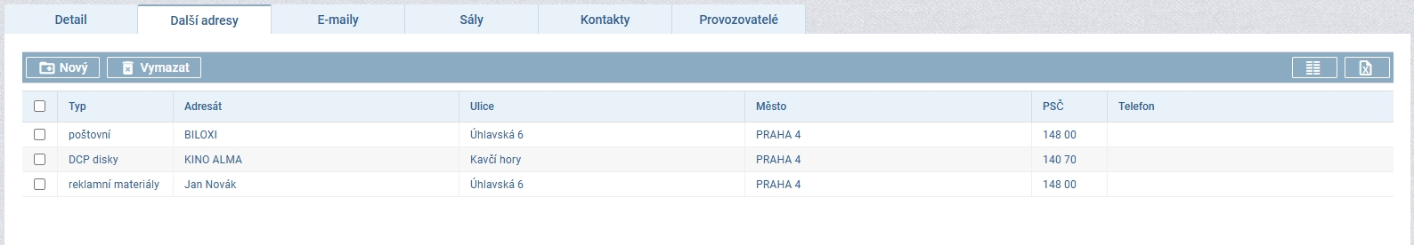 Záložka obsahující další doplňující adresy kina jako adresu pro zasílání RM, DCP apod. Adresa by měla být vyplněna pouze v případě, že se liší od obecné adresy kina.