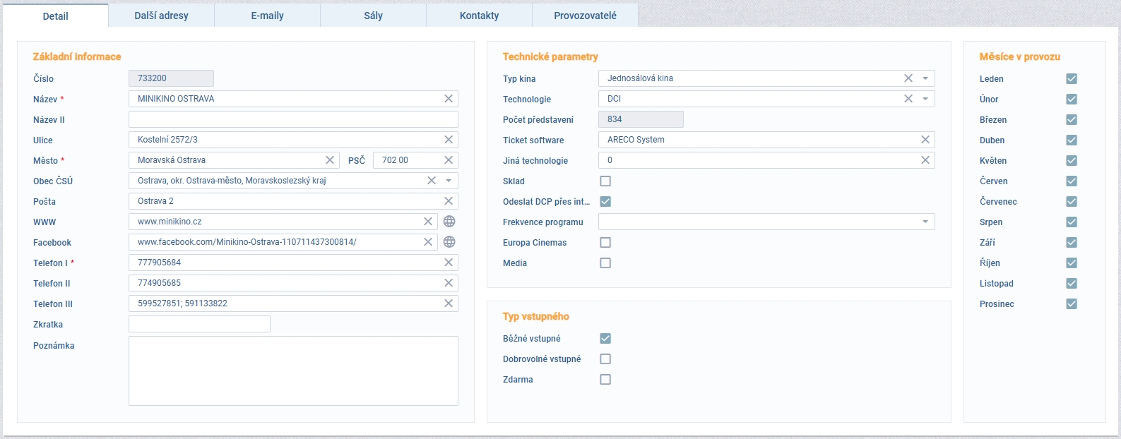 Informace o kině jsou v detailu rozděleny tematicky do několika záložek, mezi kterými je možné přepínat kliknutím na název záložky. Povinné položky jsou označeny *. Položky s šedým pozadím jsou určeny pouze pro čtení.