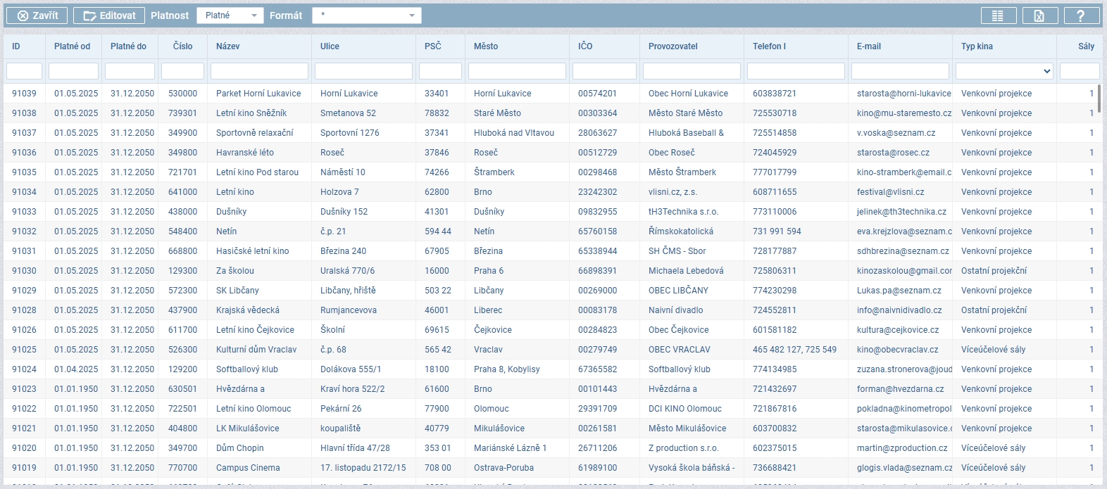 | Europa cinemas | Příznak, určující jestli je kino členem sítě Europa Cinemas. |