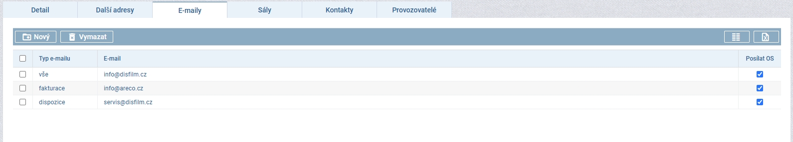 Záložka určená ke správě e-mailových adres kina. Vždy by měl být doplněn obecný e-mail s typem Vše. Ostatní e-maily by měly být vyplněny pouze v případě, že se liší od obecného e-mailu nebo obsahuje další adresy.