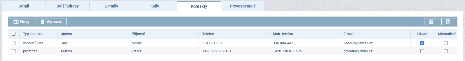 Seznam kontaktních osob kina. Příznakem Hlavní lze označit hlavní/upředňostňovaný kontakt. Příznakem Alternativní lze označit alternativní kontakt k hlavnímu kontaktu.