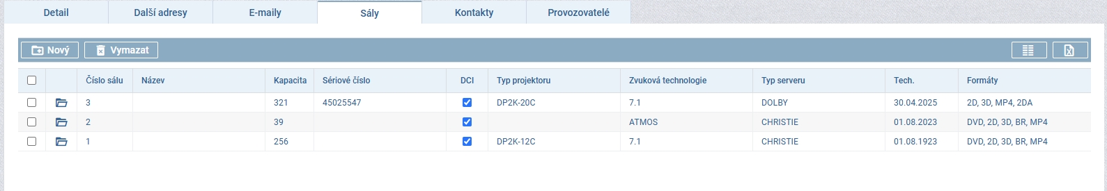 Hlavní záložka obsahující základní údaje kina a technické parametry.