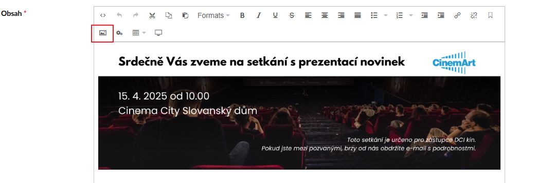 V případě potřeby zobrazit obsah novinky jako grafiku, je možné pomocí tlačíka Media picker uploadovat a zobrazit obrázek přímo v obsahu.