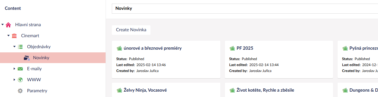 Novinky jsou umístěny v menu Objednávky -> Novinky. Nový záznam je možné vytvořit pomocí tlačítka Create Novinka. Po kluknutí na tlačítko dojde k přesměrování do detailu novinky. Editovat existují novinku je možné pomocí kliknutí na titulek novinky v seznamu existujícíh novinek.